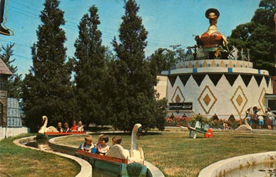 Kennywood's old Kiddie Swan Ride was a miniature version of the park's Old Mill. The Lil' Phantom kiddie coaster now occupies this site. The circular building in the background, the kiddie changing station, complete with miniature toilets still remains, although Mother Goose has since moved to the Storybook Forest section of Kennywood's sister park, Idlewild & Soak Sone.