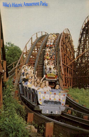This photo shows the Racer and its original trains. These trains were very much like the Jack Rabbit trains with the unadjustable lap bars. In the 1980's the four original trains were replaced with three new trains from the Philadelphia Toboggan Company.