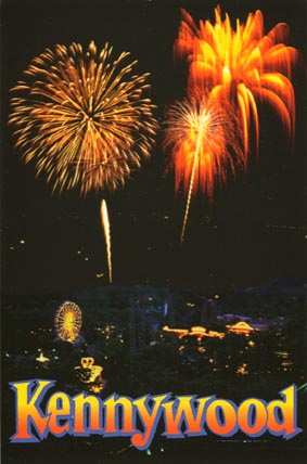 Caption: Pyrotechnics light the sky above Kennywood's world-famous coasters during Grand Victorian Days - the first week of July. It's a celebration of the era during which the beautiful amusement park was born at the end of a trolley line. |