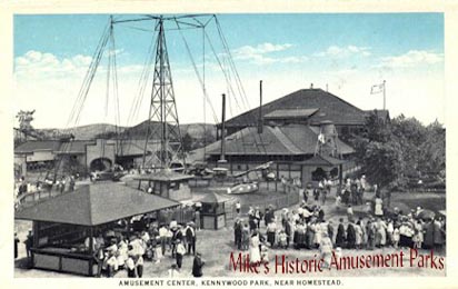 Caption: This scene depicts a few of the many attractions at Kennywood; Pittsburgh's famed amusement park, where one may enjoy wholesome fun and relaxation during the summer months.
